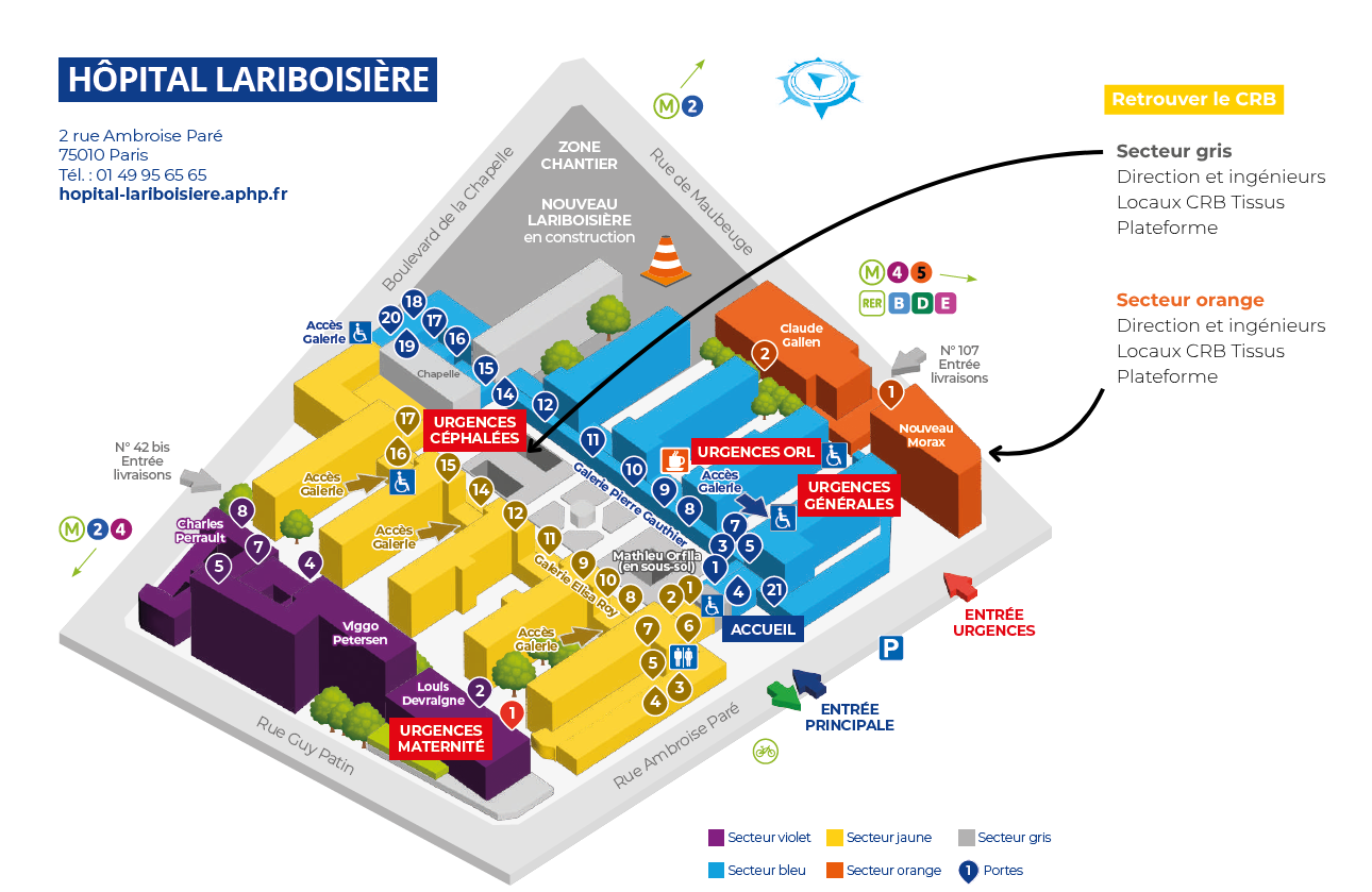 Créé en août 2009 en collaboration avec Université Paris Cité, site Diderot – Paris 7, le CRB (Centre de Ressources Biologiques) Lariboisière/Saint Louis, est une structure dédiée à la collecte, la conservation et la mise à disposition d’échantillons biologiques humains pour la recherche biomédicale (fluides biologiques et tissus). Le CRB est une structure médicale intégrée dans le DMU (Département Médico-Universitaire) BioGeM (Biologie et Génomique médicales) des hôpitaux du GHU AP-HP. Nord – Université Paris Cité.